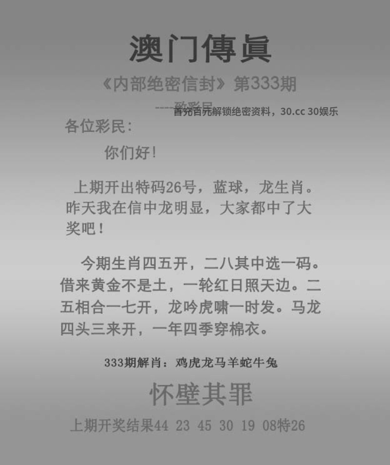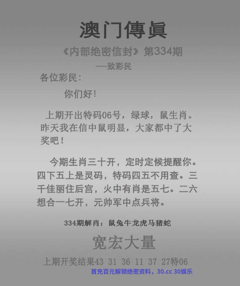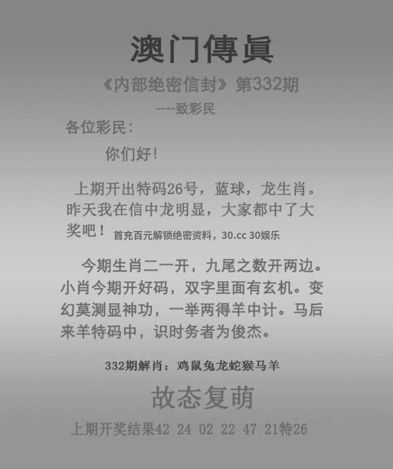 | 334期澳门马会传真解析:今期生肖三十开,定时定候提醒你。四下五上是灵码,特码四五不用查。三千佳丽住后宫,火中有肖是五七。二六想合一七开,元帅军中点兵将。 综合特肖:龙鸡蛇猴虎兔鼠猪 |