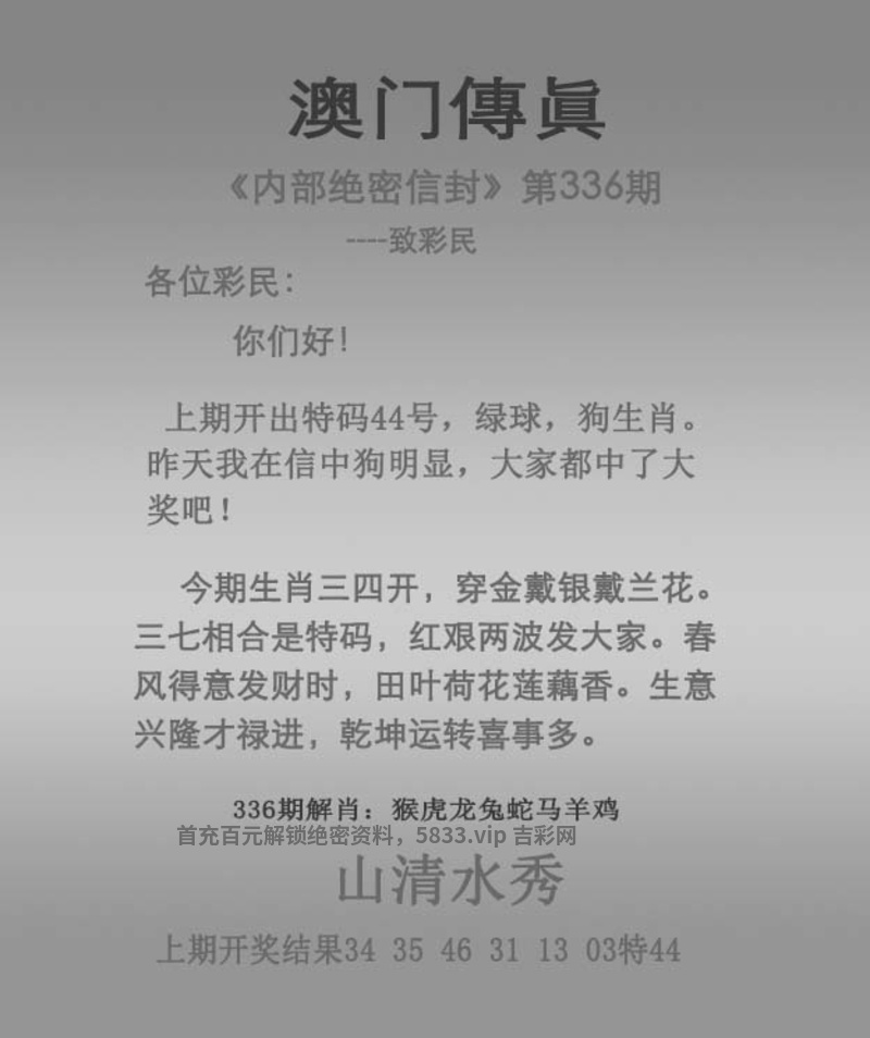 | 335期澳门马会传真解析:今期生肖三二开,二字来头七相送。回首三四要留意,玄机中看二九合。十二生肖个个知,六合在前取投机。一语双关话特码,二七美女大家求。 综合特肖:虎蛇鼠马牛狗猴鸡 |